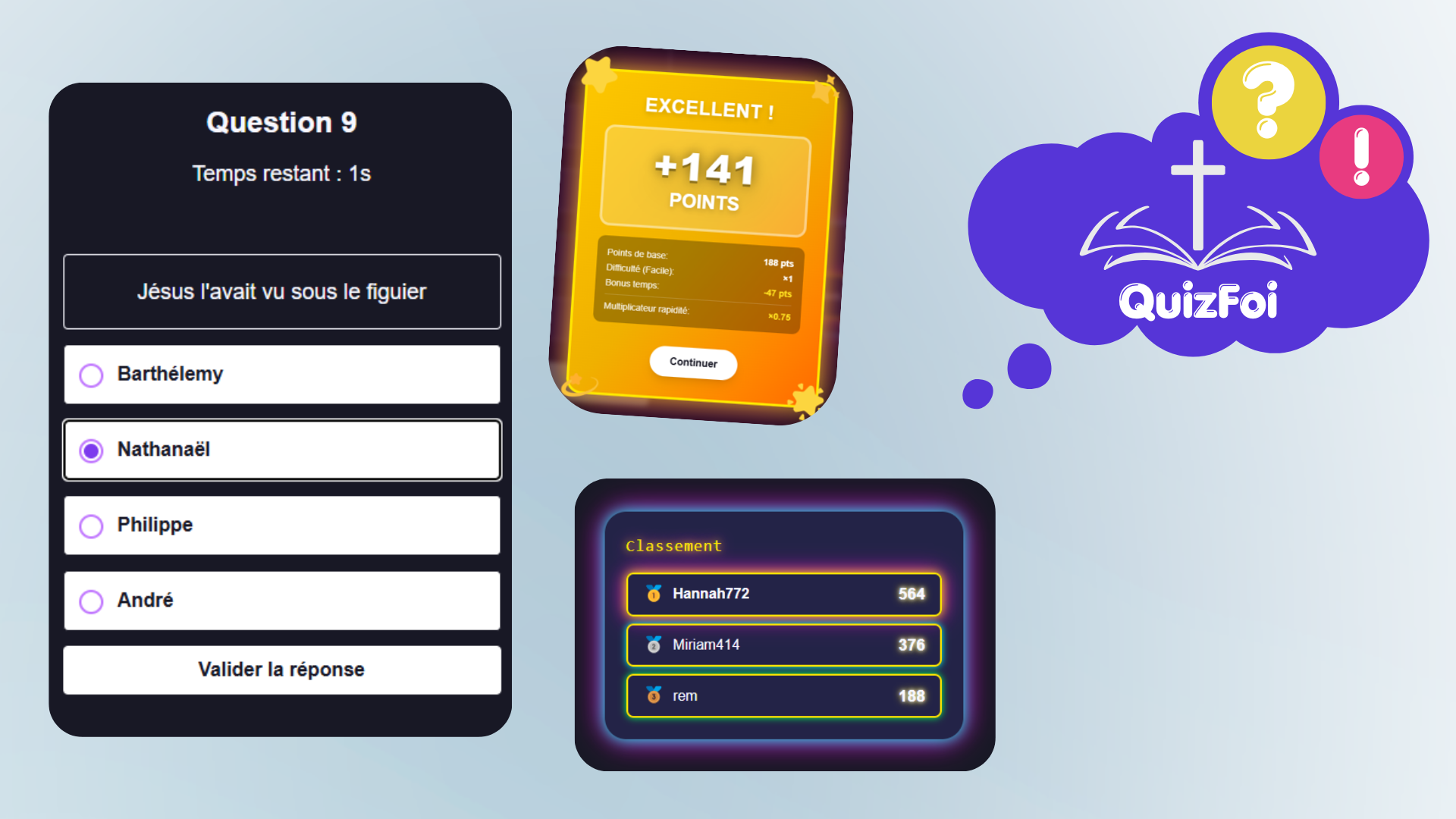 Découvrez QuizFoi, le premier quiz biblique francophone moderne : jeu chrétien en temps réel, questions bibliques interactives, parfait pour l'église, groupe de jeunes et familles chrétiennes. Plus qu'un simple quiz Bible !