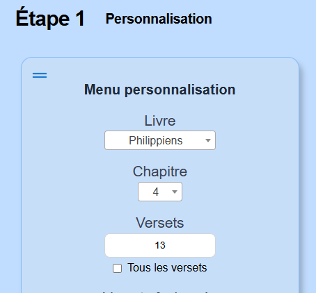 2.1 – Sélectionnez le verset souhaité (ex. Philippiens 4:13 – Je puis tout par Celui qui me fortifie.).