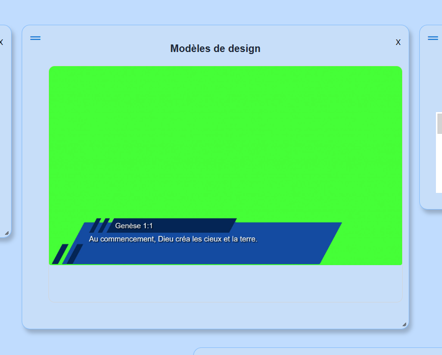 Dans Projerset, sélectionnez le modèle « overlay bas d’écran » (assurez-vous d’être en mode Expert et non Novice) avec un arrière-plan vert (fond vert). Ce fond vert servira à rendre la zone transparente dans votre diffusion. Une zone textuelle est prévue pour afficher le verset : la référence et le texte.